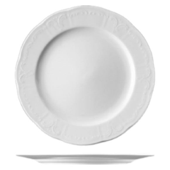 En flat tallrik med vacker relief från Benedikts serie Bellevue. Tallriken är tillverkad av slitstarkt porslin med hög motståndskraft mot repor och slitage. Perfekt för servering av både lunch- och middagsrätter på restauranger, caféer och hotell.