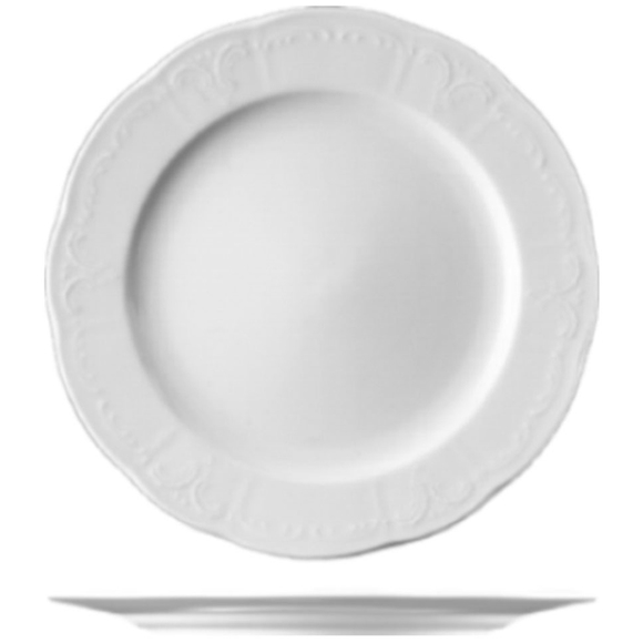 En flat tallrik med vacker relief från Benedikts serie Bellevue. Tallriken är tillverkad av slitstarkt porslin med hög motståndskraft mot repor och slitage. Perfekt för servering av både lunch- och middagsrätter på restauranger, caféer och hotell.