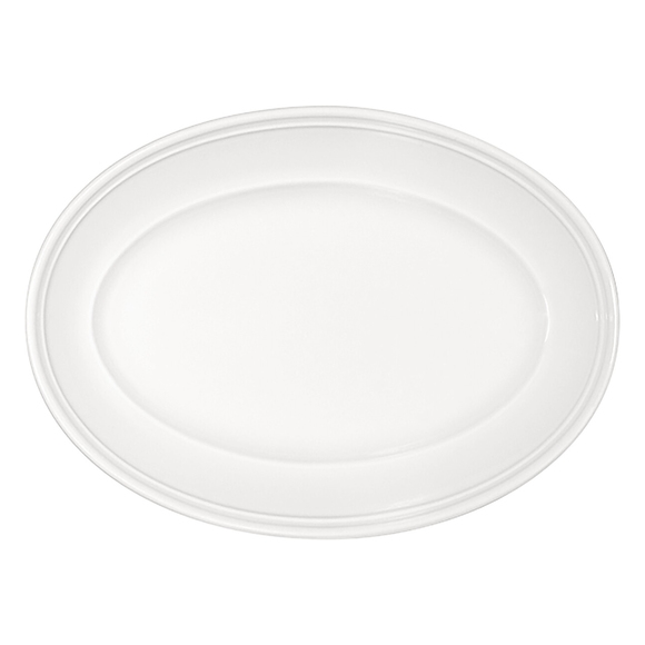 En rustik och tidlös tallrik från Bauschers serie Come4table. Den vita tallriken är platt och oval. Tallriken har en bred bräm som följer hela tallrikens yttre vilket ger ett lyxigt uttryck. Det vackra fatet kan användas både som tallrik och uppläggningsfat beroende på tillställning.