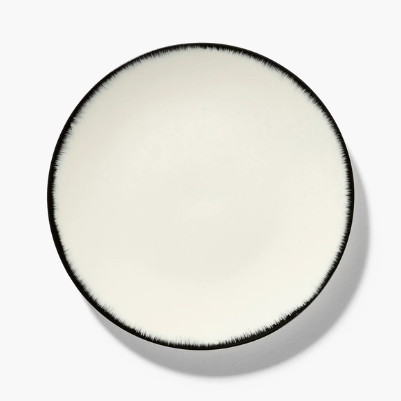 En modern tallrik från Serax serie Dé, designad av Ann Demeulemeester. Tallriken har en vit mittpunkt som omges av en svart, skuggliknande kant, vilket framhäver maten på ett smakfullt sätt. Dessutom är tallriken tillverkad av porslin med exceptionell kvalitet och hög slitstyrka. Perfekt för servering av förrätter och desserter på restauranger, caféer och hotell.