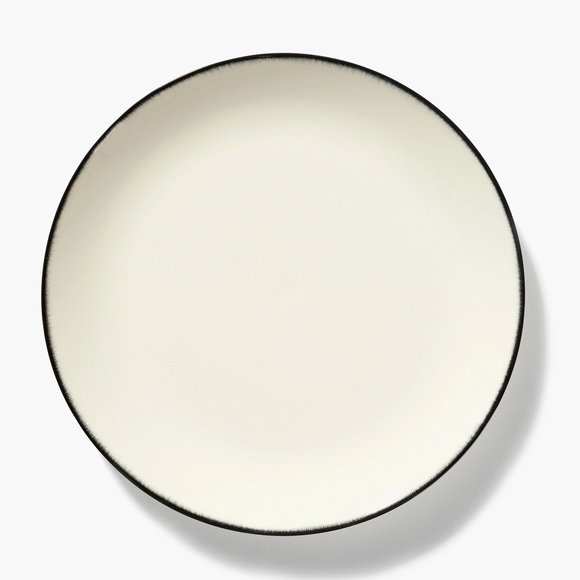 Denna eleganta “Dinner Plate”-tallrik i variation 1 från serien Dé är resultatet av samarbetet mellan Serax och den belgiska designern Ann Demeulemeester. Tallriken har en smal, svart kant som framhäver din maträtt på ett effektfullt sätt. Tallrikens exklusiva design kommer att ge din dukning en svårslagen känsla.