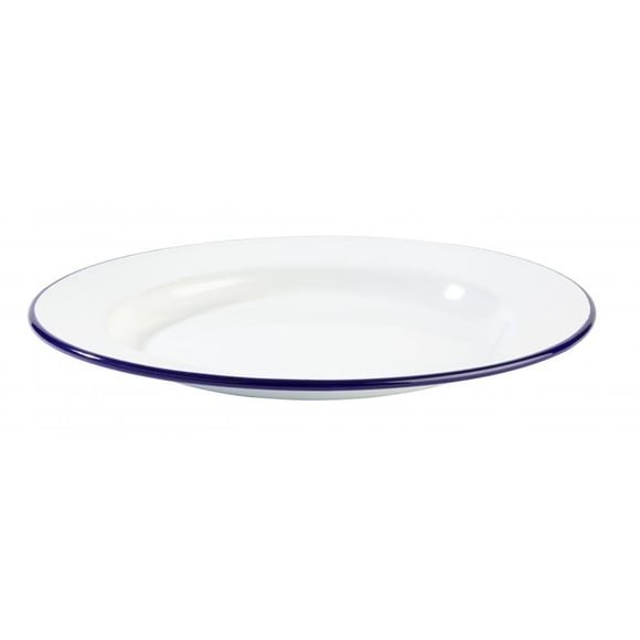 En klassisk tallrik i vitt emaljerat stål med en vacker blå rand från APS. En perfekt tallrik för servering av en mängd olika maträtter. Det emaljerade stålet ger tallriken en hög tålighet och kvalitet, perfekt till storkök och restaurang. Ett givet val av tallrik för er som vill förena funktionalitet med estetik på bästa sätt.