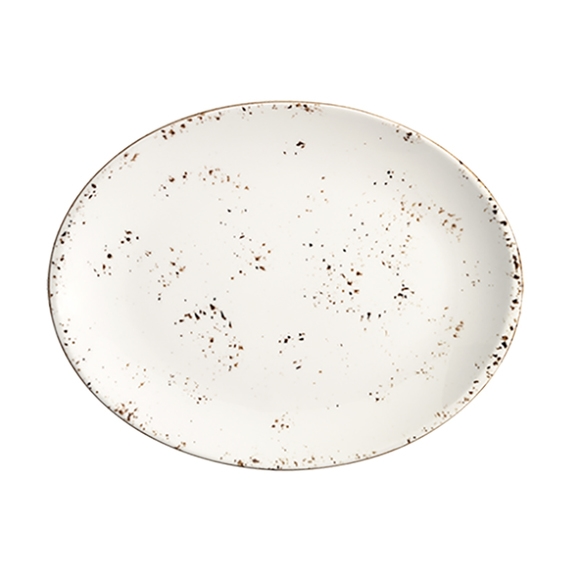 En oval, rustik tallrik från Bonnas serie Grain. Tallriken har en handmålad ovansida i naturvita och bruna oregelbundna toner. En unik tallrik som tillför en lantlig känsla till dukningen i restaurangen. Utöver den vackra designen erbjuder tallriken dessutom en slitstark och tålig kvalitet med lång hållbarhet lämpat för storkök. Ett självklart val för er som söker ett estetiskt tilltalande porslin av hög kvalitet.