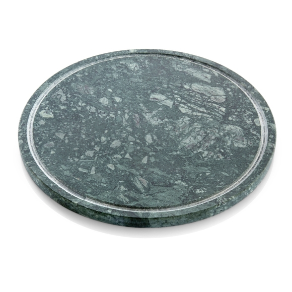 En unik och enastående tallrik i grön marmor. Tallriken sticker ut då den är en tjock men platt marmorplatta med en skåra som följer längs kanten. Denna kan användas både som en tallrik för servering men även som en bricka/fat för exempelvis ost. Den vackra färgen och det unika mönstret höjer alla dukningar.