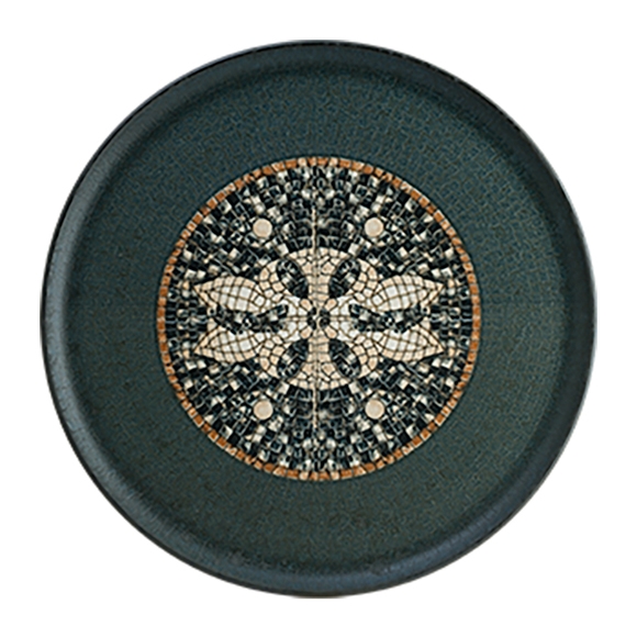 En mörkgrön tallrik med en unik design från Bonnas serie Mezopotamia. Denna exklusiva porslinsserie hämtar inspiration från mosaikerna i antika städer, och varje del i serien bär ett unikt mönster med originalfigurer från civilisationens begynnelse. Tallriken är särskilt utformad för servering av utsökta pizzor, men kan såklart även användas till servering av mycket annat om så önskas. Tillverkad av högkvalitativt porslin, tål tallriken dessutom intensiv användning utan påverkan på den vackra designen. Kombinationen av unik design och hög kvalitet gör denna tallrik till det perfekta porslinet.