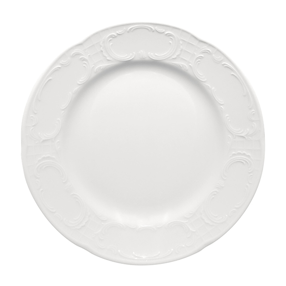 En elegant och klassisk tallrik från Bauschers serie Mozart. Den platta tallriken är vit med ett mönster som liknar stuckaturer längs kanterna. Tallriken är tidlös och smälter enkelt in i många typer av miljöer. Den större tallriken bör främst användas vid servering av huvudrätter och liknande måltider.