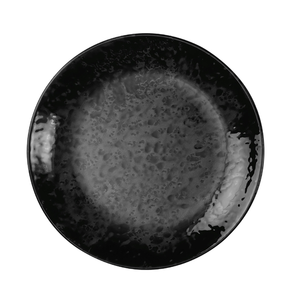 Tallrik Nano Cream flat i svart porslin från Blocho. En modern tallrik i svart med grå detaljer som ger ett unikt intryck. Tallriken är platt med en upphöjd kant och gör sig perfekt för servering av förrätter, mindre huvudrätter eller desserter. Den är väl lämpad för krävande miljöer och passar därför perfekt för restaurang och café. Tål mikrovågsugn, diskmaskin och frys.
