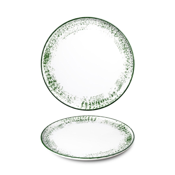 En högkvalitativ tallrik från Benedikts handmålade och rustika serie Optimo. Tallriken har en unik design med grönt handmålat mönster längs den vita tallrikens kanter. Utöver mönstret pryds kanterna av en handmålad linje vilket ramar in uppläggningen och bidrar till en förhöjd matupplevelse. Förutom ett läckert utseende är tallriken dessutom tillverkad av högkvalitativt porslin som gifter sig med miljön på restaurang- och hotellverksamheter. Kollektionen Optimo blandar, med andra ord, överlägsen kvalitet med ett tilltalande utseende.
