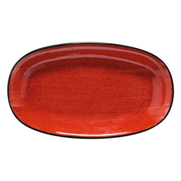 Röd, oval tallrik från Bonnas serie Passion. Tallriken är av handmålat porslin i en vacker ljusröd färg och är av hög kvalité och håller mycket väl för dagligt bruk i den hårda restaurangmiljön. Det härdade porslinet är stapelbart och motståndskraftigt mot repor och stötar. Tallriken tål även användning i ugn, mikrovågsugn och diskmaskin.