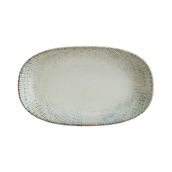 En oval tallrik med unik textur från Bonnas serie Sway. Tallrikens mönstrade kant ramar in maten på ett smakfullt sätt, samtidigt som det slitstarka porslinet garanterar långvarig hållbarhet. Perfekt för servering av förrätter, bröd, tilltugg och desserter på restauranger och hotell.