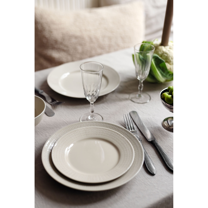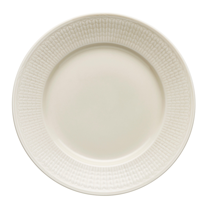 En tallrik i vackert beiget porslin ur Rörstrands populära serie Swedish Grace. Den är utsmyckad med ett stilrent mönster längsmed kanten som ger ett elegant intryck. Tillverkad i tåligt fältspatporslin.