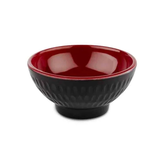 En iögonfallande och rustik skål från APS serie Asia Plus. Skålen är i en modell som passar perfekt till snacks och tillbehör i olika former. Den är gjord i melamin vilket är ett slittåligt material som passar utmärkt att använda på restauranger. Den användbara skålen har en mattsvart utsida och en röd glansig insida som passar utmärkt på bland annat asiatiska restauranger.