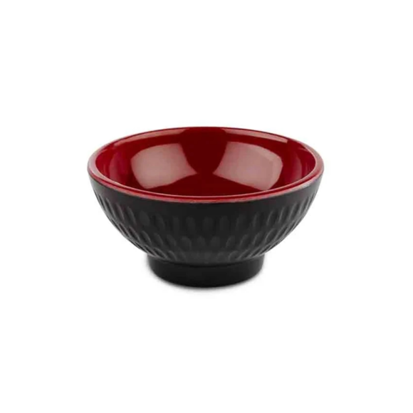 En rustik och vacker skål från APS serie Asia Plus. Den är i en mycket liten modell som rymmer soya, sås och andra liknande tillbehör. Skålen är gjord i melamin vilket är ett slittåligt material som passar utmärkt att använda på restauranger. Den tilltalande skålan har en mattsvart utsida som har ett strukturerat mönster och en glansig röd insida.
