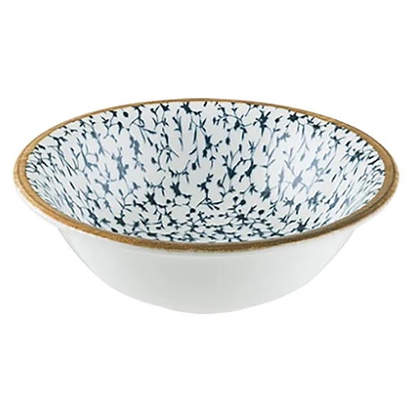 En unik och vacker skål från Bonnas serie Calif. Skålen är djup och i en mindre modell som passar utmärkt att servera mycket i. Utsidan av skålen är vit medans insidan har en guld/brun linje längs kanten samt ett vackert mörkblått mönster. Skålen passar utmärkt vid frukostserveringen på hotell, restauranger och caféer.