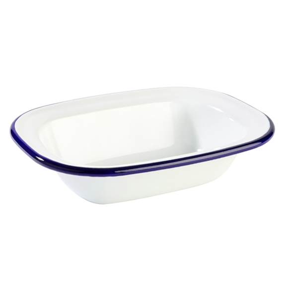 Skål emalj rekt 20cl 16x12cm H3,5cm vit med blå rand