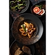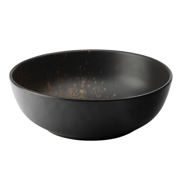 En svart skål med guldfärgat mönster från Utopias serie Oxy. Skålen är tillverkad av slitstarkt porslin med hög motståndskraft mot repor och slitage, vilket gör den väl lämpad för användning inom hotell- och restaurangbranschen. Perfekt för allt från frukostar och tillbehör till sallader och soppor.