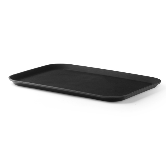 Praktisk, svart barbricka i rektangulär form från svenska Patina. Barbrickan är i generös storlek och tillverkad i gummibelagt glasfiber, som är både trevligt att servera med och tåligt. Gummit gör att glasen står stadigt på brickan och är enkel att servera från.