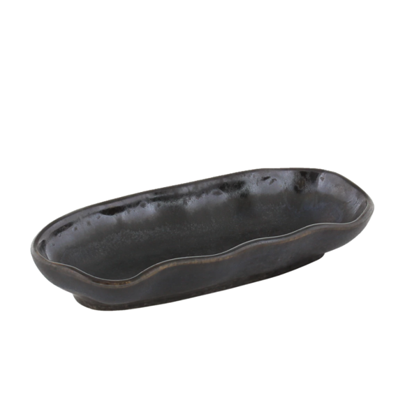 Porslinsserien Nami från Playground finns i flera utföranden med en vacker vågformad design och harmoniska färger. Detta ovala fat i färgen Ebony utgör ett stilfullt inslag till det dukade bordet.