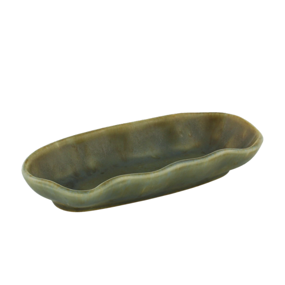 Porslinsserien Nami från Playground finns i flera utföranden med en vacker vågformad design och harmoniska färger. Detta ovala fat i färgen Olive utgör ett stilfullt inslag till det dukade bordet.
