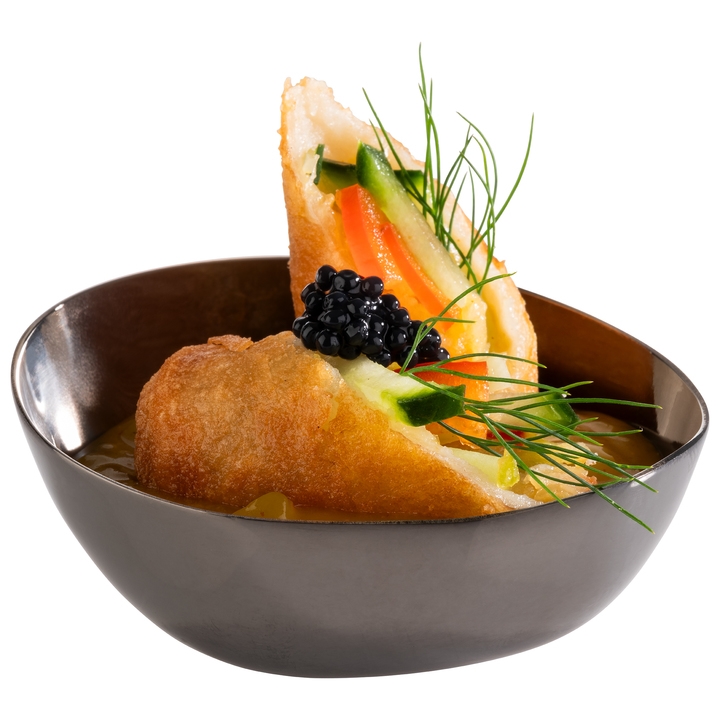 Svart miniskål från APS:s serie Pebbles, tillverkad av rostfritt stål med PVD-beläggning. Beläggningen resulterar i en modern och unik gunmetall-look som framhäver maten på ett tilltalande sätt. Perfekt för servering av mindre rätter och tillbehör på restauranger och hotell.