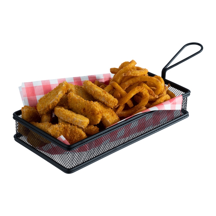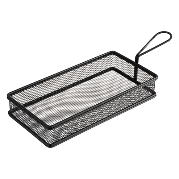 En fritöskorg från APS som har många olika användningsområden. Den mindre korgen är gjord i rostfritt stål med en svart beläggning som får behållaren att hålla länge. Korgen är rektangulärt formad med ett handtag som gör den enkel att förflytta. Denna kan användas som snackholder vid servering av olika tillbehör.