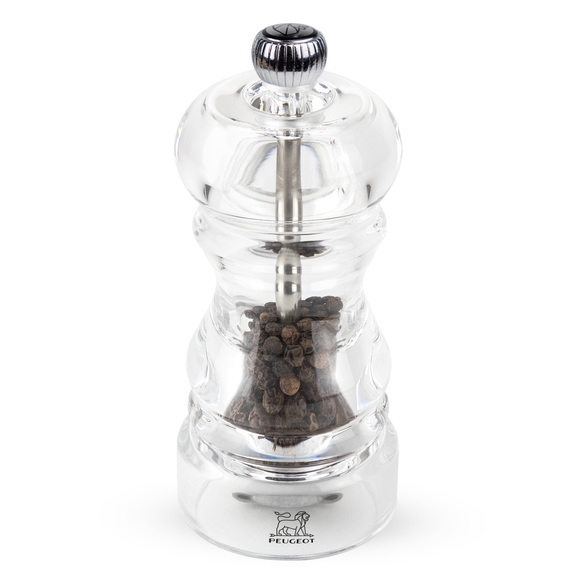 En mycket elegant och smakfull pepparkvarn från Peugeot med transparent kropp och stålkärna. Saltkvarnen har ett exemplariskt malverk för svartpeppar, vitpeppar, röda bär och korianderfrön