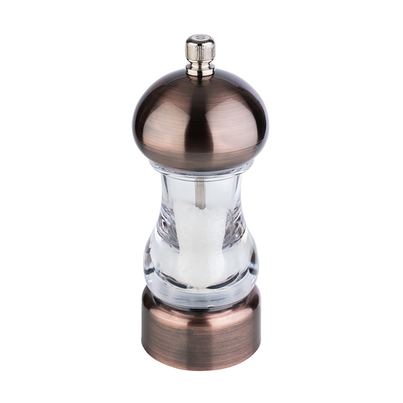 En snygg och effektiv saltkvarn från APS. Kvarnen har en tilltalande design med en kopparfärgad topp, botten samt en transparent mitten. Att kvarnen är genomskinlig gör att det enkelt går att avgöra när det är dags att fylla på med saltkorn. Kvarnens slipgrad kan justeras efter behov vilket gör denna mycket praktisk. Den vackra och stilrena kvarnen passar i miljöer på diverse restauranger, caféer och hotell.