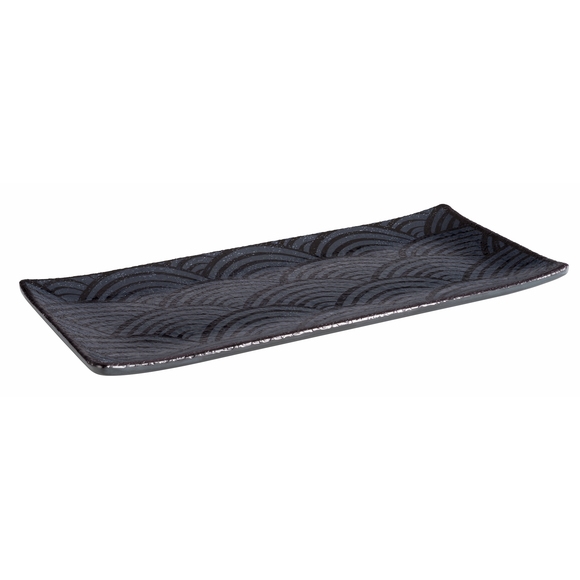 Fat Dark Wave melamin 23x10,5cm Svart Mönster från APS är ett dekorativt fat med sobert mönster. Den mörka ytan med det diskreta mönstret blir en snygg konstrast till de flesta maträtter. Med sin rektangulära form passar den både som liten bricka, uppläggningsfat och tallrik. Fatet går att stapla vid förvaring. Melamin är ett mycket hållbart material och tål maskindisk.