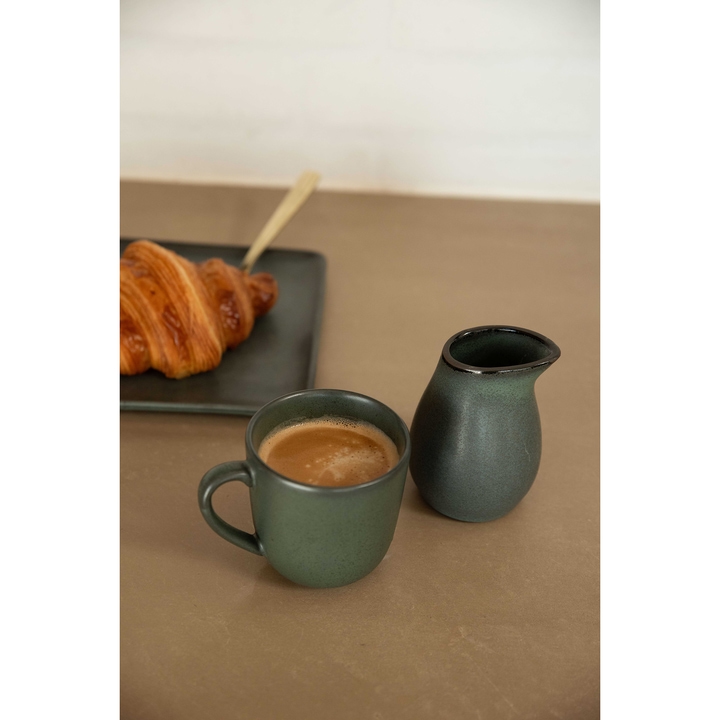 En handgjord mjölkkanna i färgen Northern Green från Aidas serie RAW. Kannan är tillverkad av dubbelbränt stengods för extra hållbarhet, samtidigt som den reaktiva glasyren och dess unika, råa utseende ger ett stilrent intryck. Perfekt för servering av grädde och mjölk till kaffet på restauranger, barer och hotell.