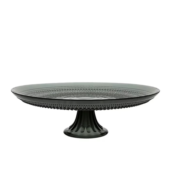 Ett grått tårtfat av hög kvalitet från Fortessas Jupiter-serie. Fatet är dekorerat med ett droppliknande mönster och står på en fot som lyfter fram och presenterar dess innehåll. Perfekt för servering av tårtor, pajer, snittar, frukt och mycket mer på buffén, restaurangen och hotellfrukosten.