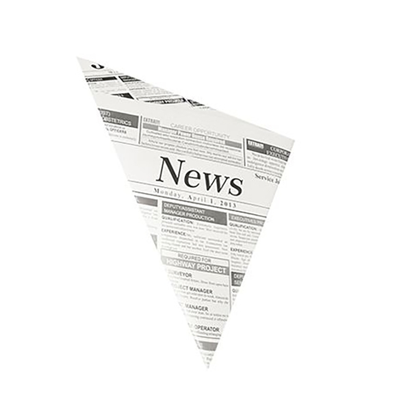 1000 Pappersstrut, Pergament papper 27 cm x 19 cm x 19 cm "Newsprint" innehåll 125 g, fettbeständigt från Papstars sortiment Pure Collection. Strutpåse av smörpapper med fettbeständiga egenskaper i den klassiska designen av en gammal engelsk tidning. Pappersstruten är både smidig och trevlig att servera ur och passar perfekt till den brittiska paradrätten fish'n ships, eller varför inte till en smarrig hamburgare med pommes?
